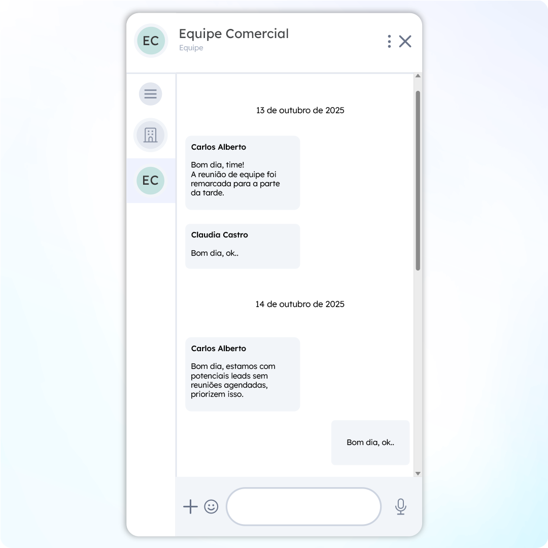Seja para tirar dúvidas, direcionar uma demanda ou resolver algo urgente, o Chat Interno ajuda a manter o fluxo de trabalho fluindo.